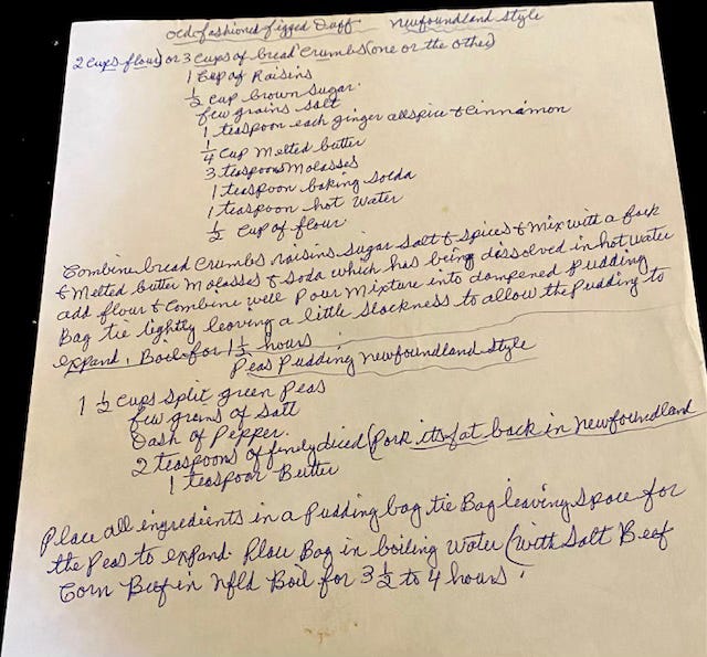 And, in honor of my dear, departed mama, I am for the first time sharing her handwritten recipe for two boiled dishes often featured in a Newfoundland boiled “Jiggs Dinner” of corned beef and cabbage. Pease Pudding, a savory concoction and side dish, and Figgy Duff, a dessert that’s a form of raisin cake, with zero figs involved. A pudding bag constructed of unbleached cotton holds the masses of ingredients together during long boiling. Looooong. As in hoe the garden, play some cards, practice the fiddle, hold a dance party… Irish jig, anyone?